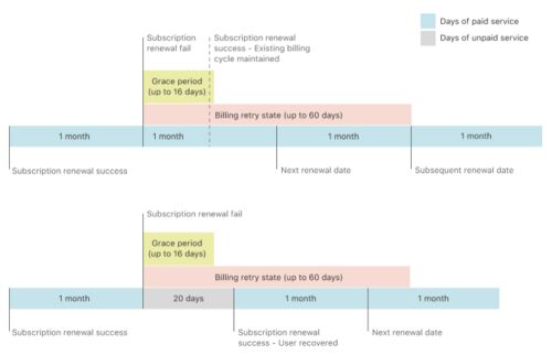 概要 AppStoreでGrace Period機能がリリースされたました。 これはその機能の検証を行った結果です。 ※Appleは気づいたら仕様変更することもちょこちょこあるので、こちらの結果が常に正しいとは信じず参考程度に捉えてください 前提知識 サブスクリプション…