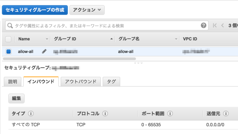 まずは全tcpアクセスを許可する設定を作ってみます。