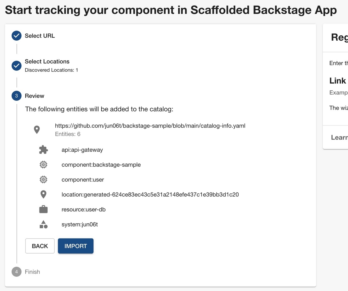 Publicなリポジトリであれば(例として https://github.com/jun06t/backstage-sample/blob/main/catalog-info.yaml を読み込ませます)